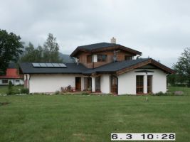 Tento pěkný dům je obklopen krásně zelenými plochami golfových hřišť v Čeladné. Solární systém složený ze pěti kolektorů Thermosolar 300 má sice trochu menší sklon, ale jeho zvýšení by příliš narušilo architektonický vzhled domu. Energetické zisky slouží k ohřevu pitné vody a přebytky jsou akumulovány ve velké (4 m3) akumulační nádrži pro ústřední vytápění.řízení systému zajišťuje elektronická regulace DX 4132.